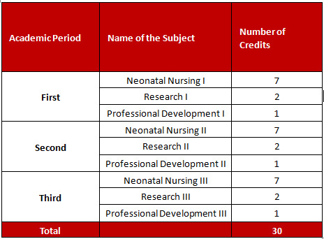 To train specialized nursing professionals, experts in the comprehensive care of healthy newborns and those with low, medium and especially high-risk health problems, taking into account the participation of the family and its sociocultural context. In addition, it aims to promote applied research among nursing professionals responsible for newborn care and to comprehensively develop the professional as a human being.